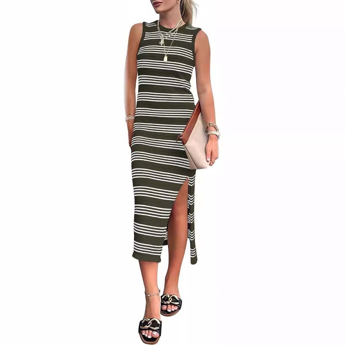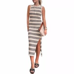Casual Mid-length Sleeveless Hollow-out Knitted Side Slit Striped Vest Dress